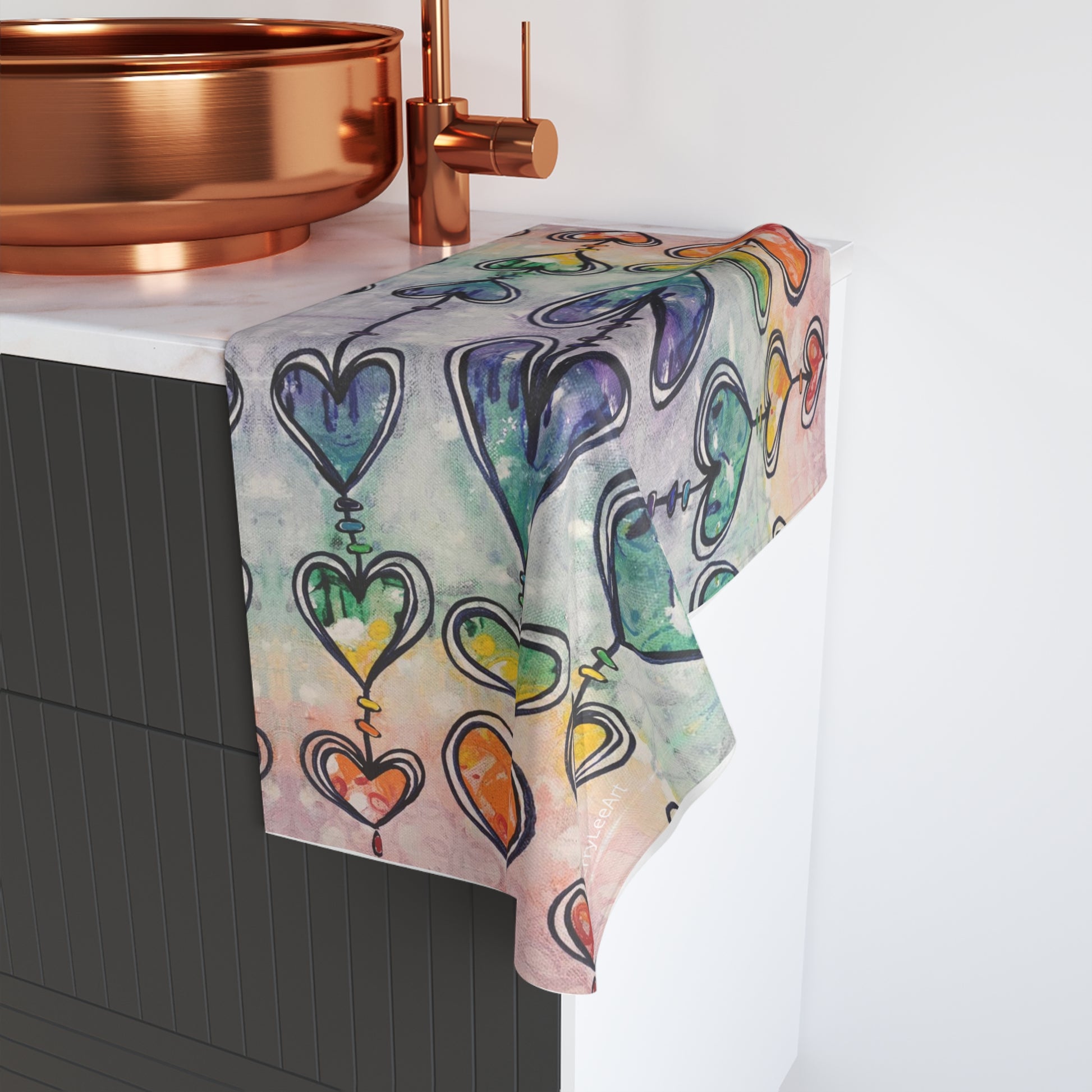 The Rainbow Hearts art towel by Kerry Lee brings warmth, meaning, and joyful color into everyday spaces. Featuring her original Rainbow Hearts painting, this kitchen and bathroom towel transforms daily rituals into moments of affirmation and care. Stacked heart forms in a rainbow palette symbolize unity, diversity, and the quiet strength of love expressed through presence and compassion.